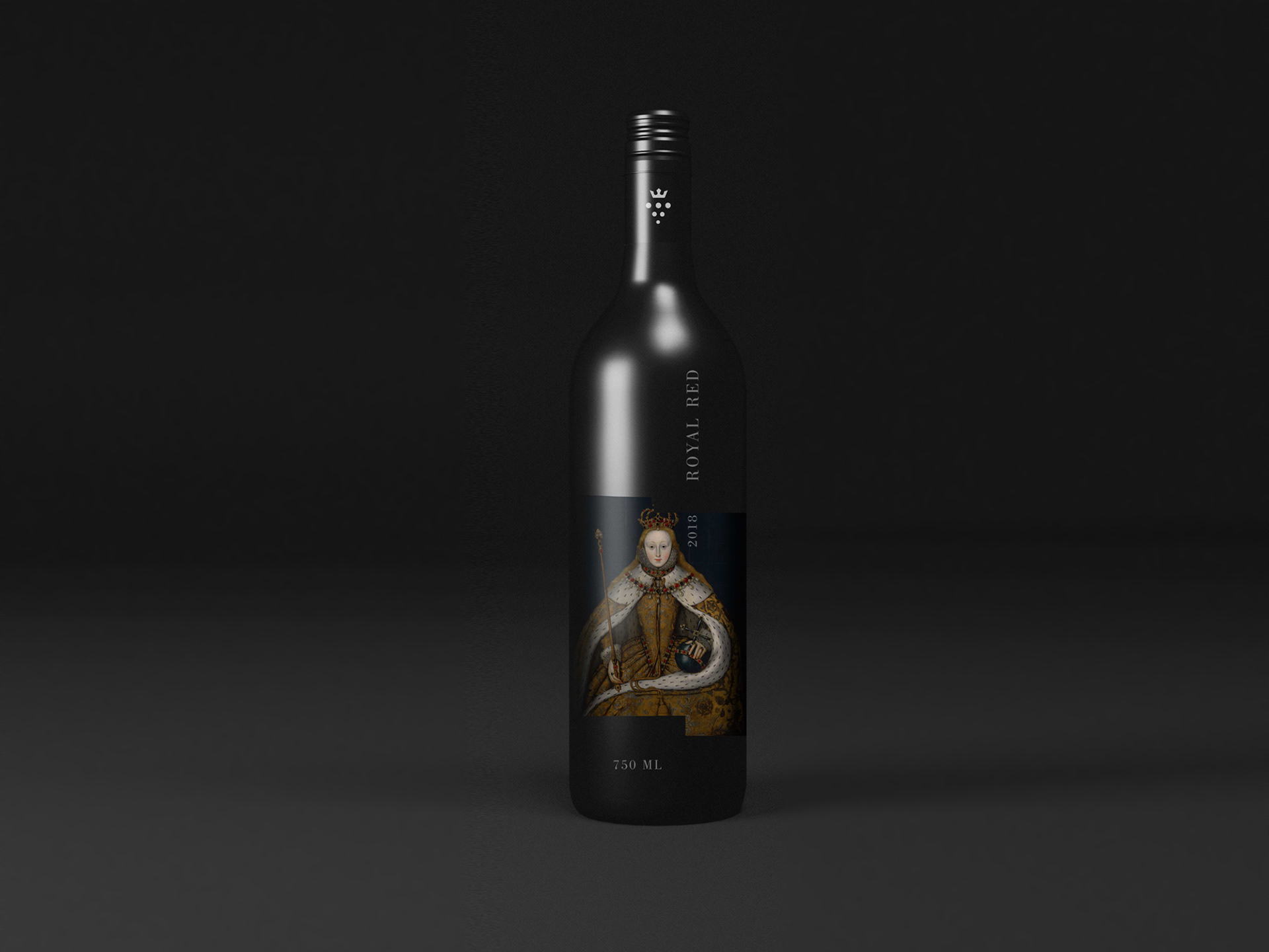 Logo, wine label and bottle packaging design for Crown Vineyard. The vine leaf attached to the grapes is replaced with a crown to mimic the leaf pattern in the logo. The design of the packaging is reflective of the wine which is dark and bold.